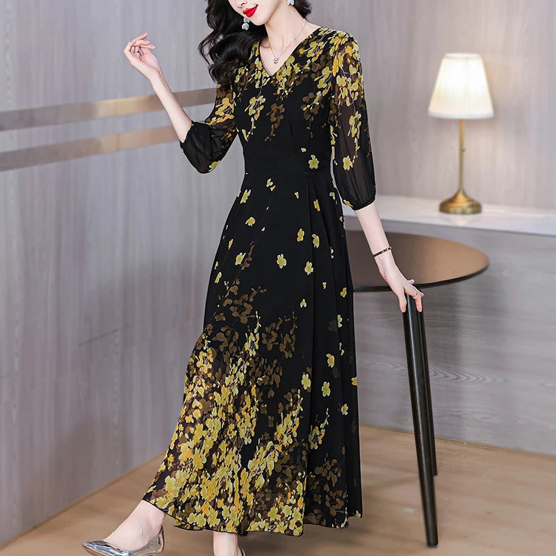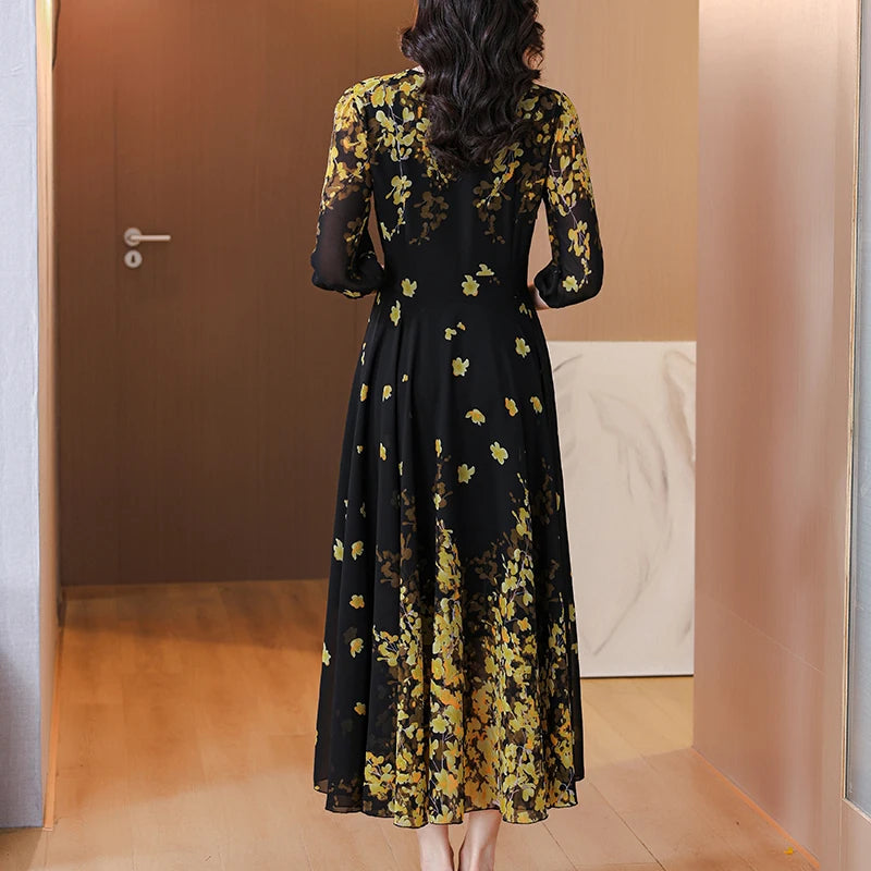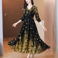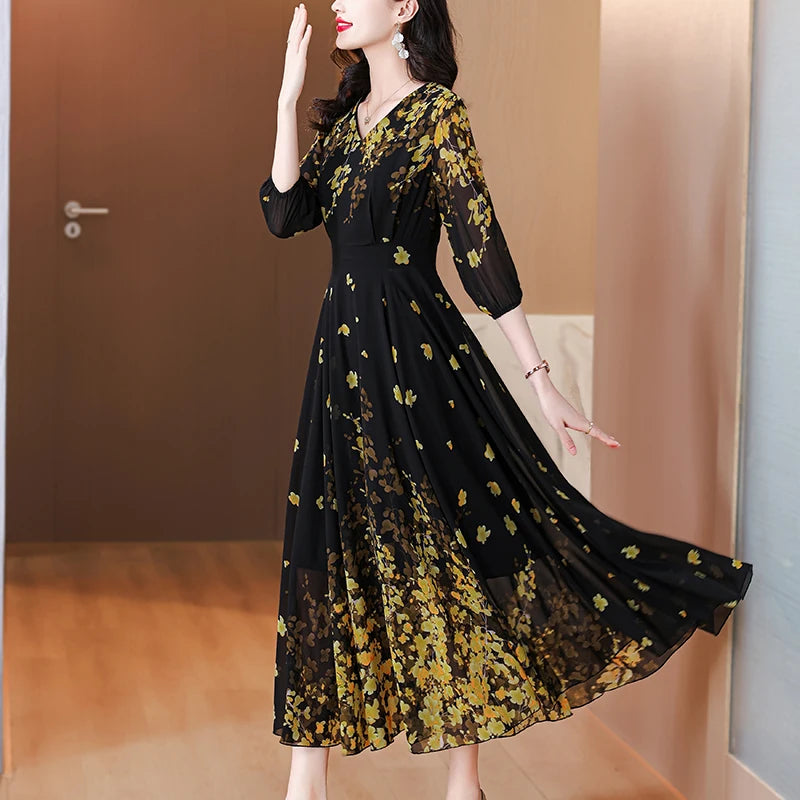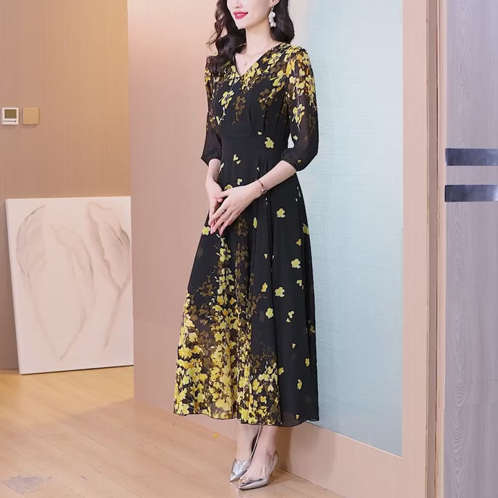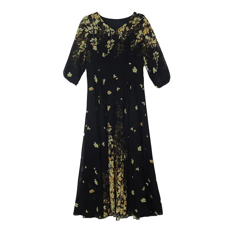 Our elegant Hepburn Loose Midi Dress flows beautifully with every step, featuring sheer sleeves and a flattering V-neckline that enhances your silhouette. Perfect for evening dinners, garden parties, or a refined day out. It blends comfort, sophistication, and timeless charm.